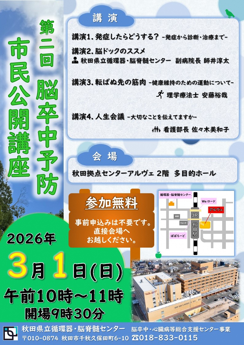 第2回 脳卒中予防 市民公開講座 ホーム 第2回 脳卒中予防 市民公開講座 日時 2026年3月1日(日) 午前10時~11時 開場:9時30分 場所 秋田拠点センターアルヴェ 2F 多目的ホール 料金 参加無料 事前申込み不要 お問い合わせ 秋田県立循環器・脳脊髄センター ☎ 018-833-0115