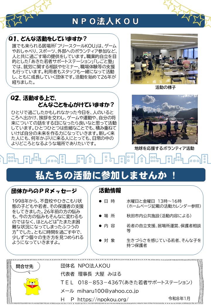 NPO法人 KOU ホーム 館内施設のご案内 3F 市民交流サロン ☆市民活動団体等のご紹介☆ 団体名別(50音順) か行 NPO法人 KOU PDFデータ 人権又は平和/子どもの健全育成/職業能力開発、雇用機会拡充の支援 NPO法人 KOU Kids Village Akita CAPあきた NPO法人 KOU NPO法人 ここはぐ NPO法人 COZYサークル 特定非営利活動法人 子育て応援Seed こまちほ~ぷ隊 一般社団法人 コラップ 傾聴ボランティア秋田「ダンボの会」 国際教養大学 環境クラブ