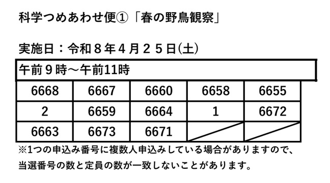 自然科学学習館 科学つめあわせ便①「春の野鳥観察」抽選結果・当選されたかたへの連絡