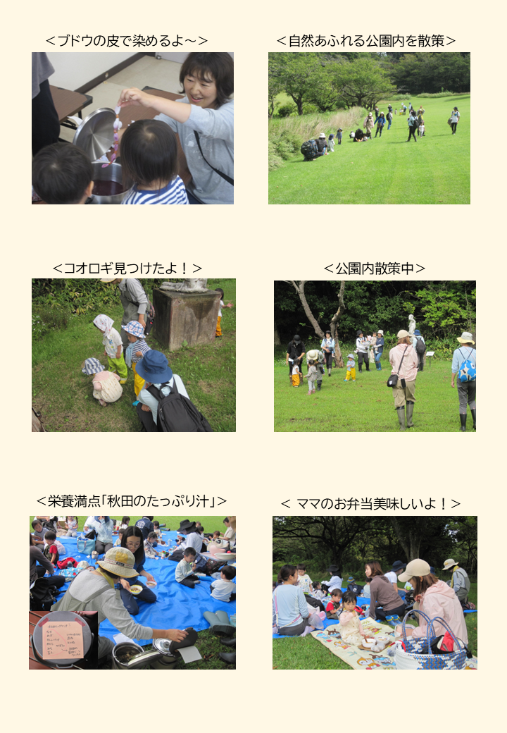 自然豊かな大森山公園で、秋田の家族と山形、千葉からの移住者やAターンの方などが参加し、草木(ブドウの皮)染めや散策など、大自然を満喫しながら家族同士の交流を行いました。