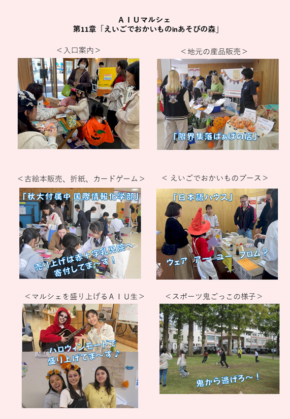 「AIUマルシェ」は、国際教養大学の学生活動団体で、同大学生、留学生、地域の方の三者が出店するマルシェを年に4回キャンパス学生会館で開催しており、今回の第11回「AIUマルシェ」では、ハロウィンをモチーフとした様々なブースが出店し、多くの参加者で賑わいました。