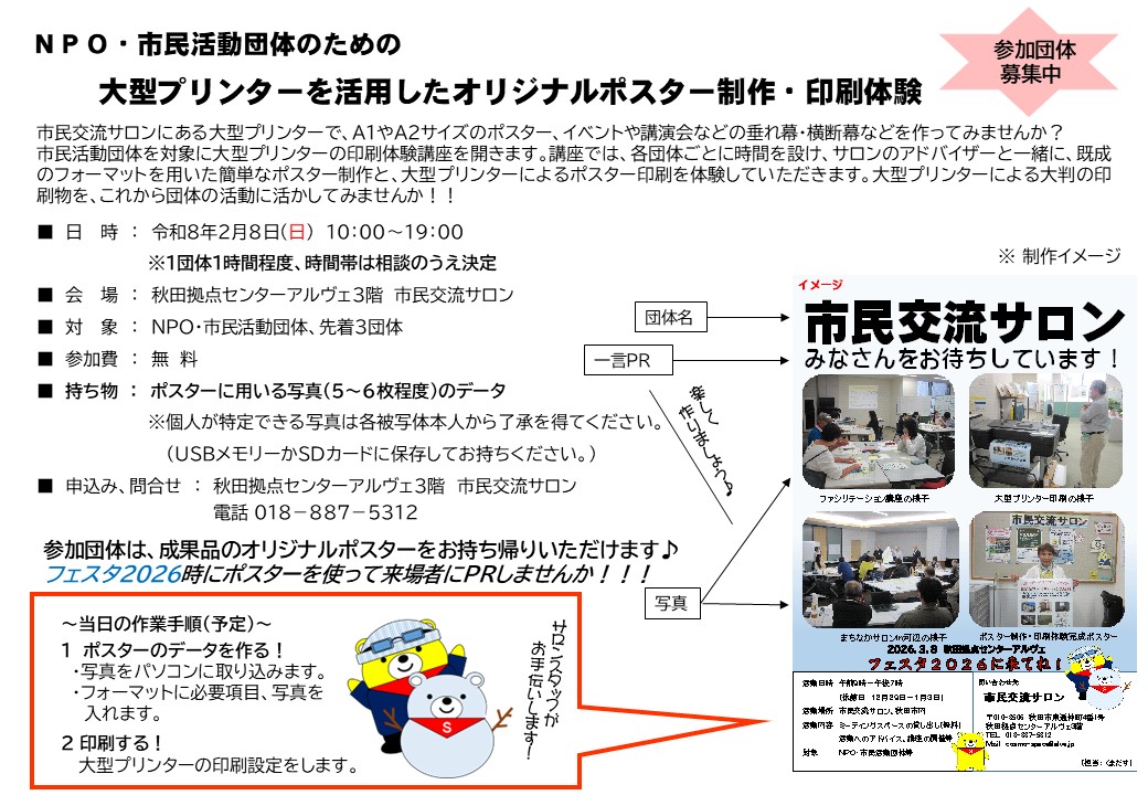 この講座では、持参した写真データを使って、団体の活動紹介ポスターを制作し、大型プリンターでの印刷を体験できます。くわしくは添付をご覧ください。