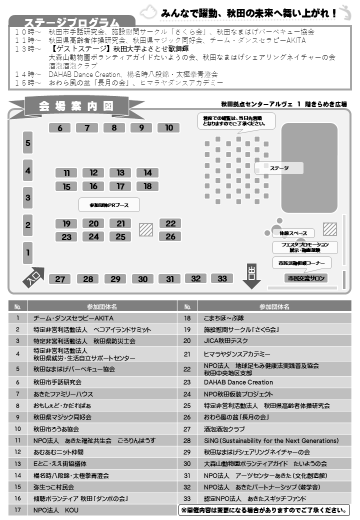 また、午後1時00分からは、ゲストの秋田大学よさこいサークル「よさとせ歌舞輝」がステージショーを開催します。入場は無料です。ぜひ、お越し下さい。