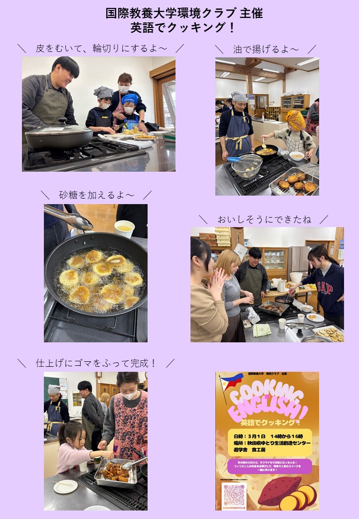 このイベントは、「秋田市地域づくり交付金事業」の採択事業として、地域住民と大学生・留学生が世代や国を超えて交流する機会をつくることを目的に実施されました。さつまいもは、環境クラブで育て、地域住民と一緒に収穫したものだそうです。環境クラブは、畑、竹林、フードロス削減など、複数の部門に分かれ、幅広い活動を行っているそうです。今後の活動にもぜひご注目ください。環境クラブのみなさん、お忙しい中、ありがとうございました。